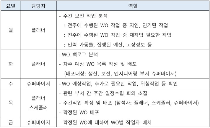 일정 수립을 위해 필요한 정보 보전 작업 일정 확정을 월간 단위로 할 수 있지만 생산일정이 변경되는 경우가 많아 주간 단위로 일정을 수립하는 것이 선진사례라 볼 수 있습니다. 주간일정 수립을 위해서는 몇 가지 정보를 확인하여야 합니다. - 차주 생산 휴지 일정 (날짜와 시간) - 보전 가용 인원 정보 (휴가, 교육, 출장 등으로 인한 비가동 인력 정보) - 소요되는 자재 및 공기구 가용성 - 외주 용역 인력 가용성 - 보전 예산 등 □ 요일별
